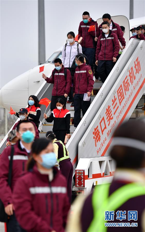 3月17日,醫(yī)療隊(duì)隊(duì)員抵達(dá)海南??诿捞m國(guó)際機(jī)場(chǎng)。新華社記者郭程攝