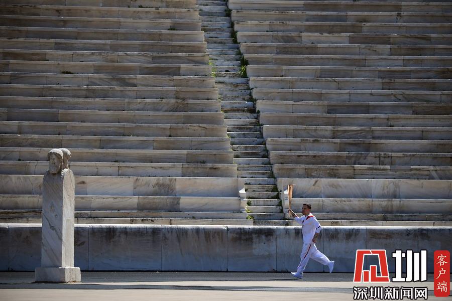 3月19日,希臘藝術(shù)體操運動員埃萊夫塞里奧斯·彼得羅尼亞斯手持圣火火炬跑入體育場。