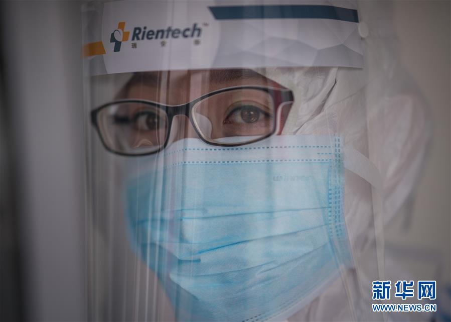 3月19日,在武漢市肺科醫(yī)院隔離病房,內蒙古醫(yī)療隊隊員在工作中。 新華社記者 肖藝九 攝