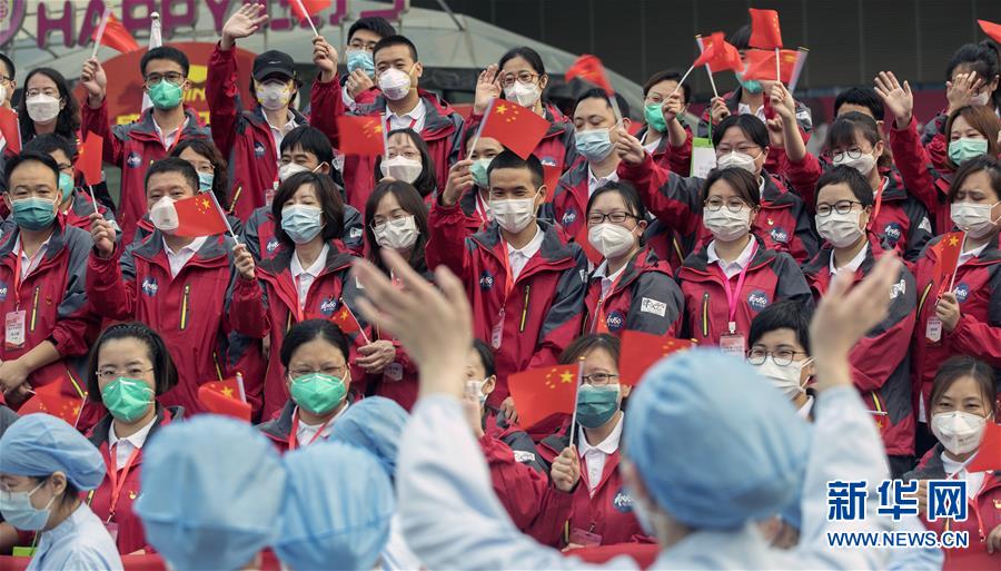 3月21日,武漢市第一醫(yī)院的醫(yī)護(hù)人員(前)送別天津市醫(yī)療隊隊員。新華社記者費茂華攝