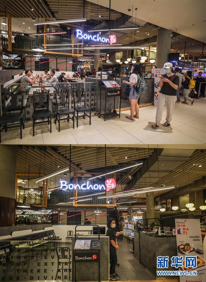 這是3月21日拍攝的泰國曼谷暹羅百麗宮商場負(fù)一層的美食城(上圖)和3月22日拍攝的美食城對比圖。商場除了負(fù)一層的美食城和超市外,全部關(guān)閉。美食城只對顧客提供外賣服務(wù)。新華社記者張可任攝
