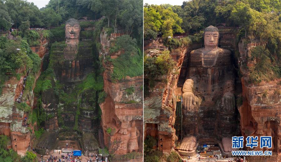 這是一張拼版照片:左圖為體檢與搶救性修復(fù)工作前的樂山大佛(2018年10月4日無人機(jī)拍攝);右圖為體檢與搶救性修復(fù)工作后的樂山大佛(3月29日無人機(jī)拍攝)。新華社記者江宏景攝