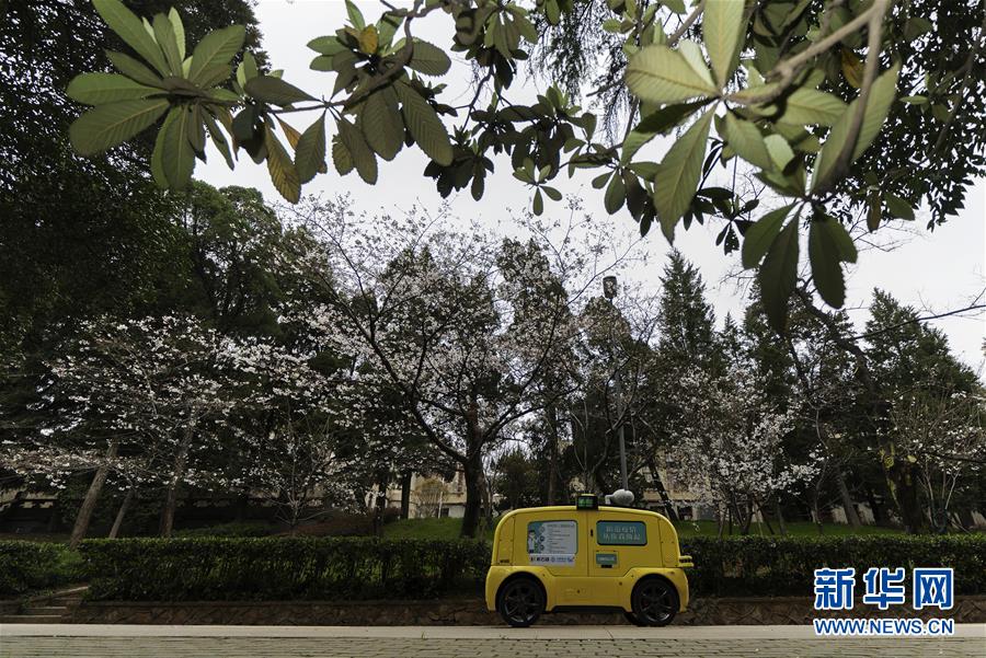 一輛5G無人攝像車在武漢大學(xué)櫻花大道進(jìn)行不間斷無人巡游,實(shí)時(shí)采集和傳輸直播圖像信號(hào)(3月16日攝)。新華社記者費(fèi)茂華攝