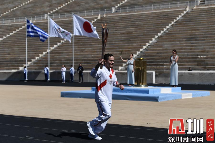 3月19日,希臘藝術(shù)體操運(yùn)動(dòng)員埃萊夫塞里奧斯·彼得羅尼亞斯手持圣火火炬跑入體育場(chǎng)。