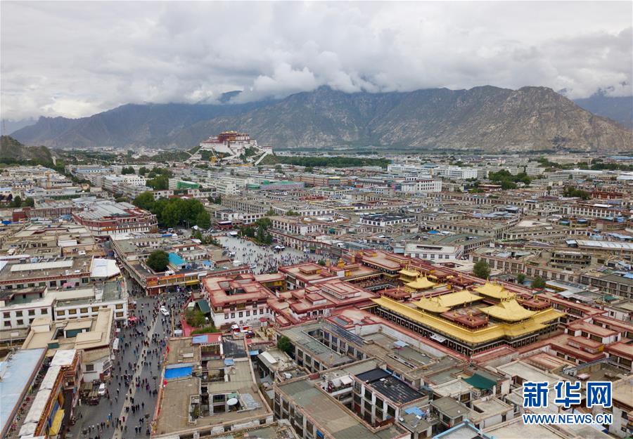 8月10日無人機(jī)拍攝的大昭寺和遠(yuǎn)處的布達(dá)拉宮。新華社記者侯東濤攝