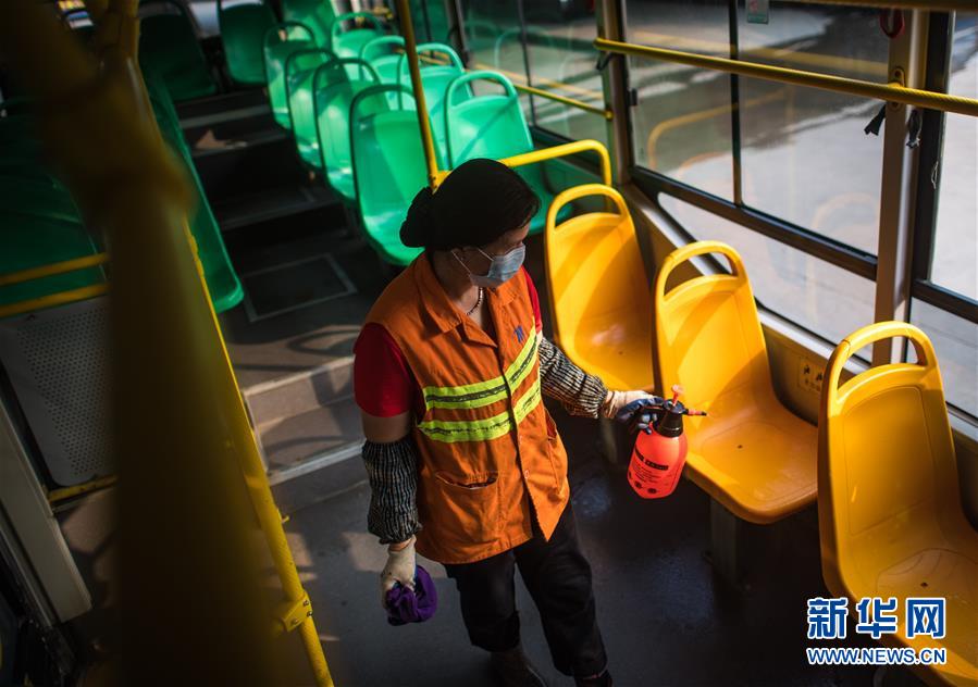 3月23日,武漢公交集團(tuán)站務(wù)公司保潔員趙真香在為一輛公共汽車消毒清洗。新華社記者肖藝九攝