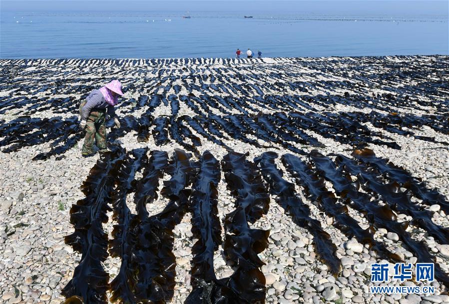 海島居民在大欽島鄉(xiāng)東村的海灘上晾曬海帶(5月23日攝)。新華社記者朱崢攝