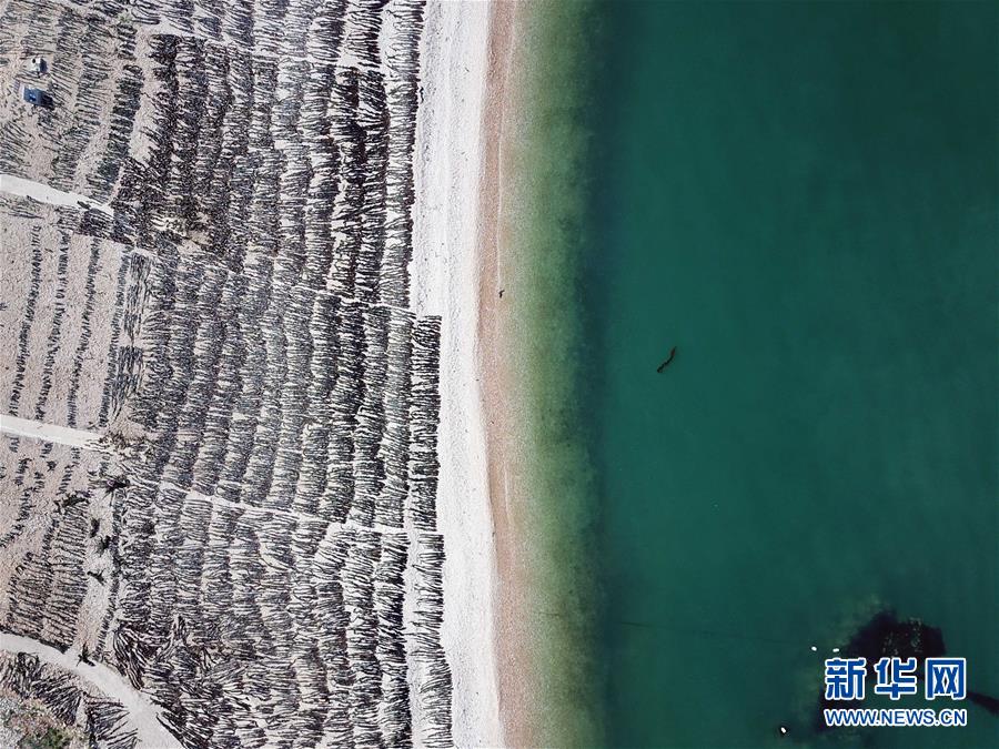 這是大欽島鄉(xiāng)東村海灘晾曬的海帶(5月23日無(wú)人機(jī)拍攝)。新華社記者朱崢攝