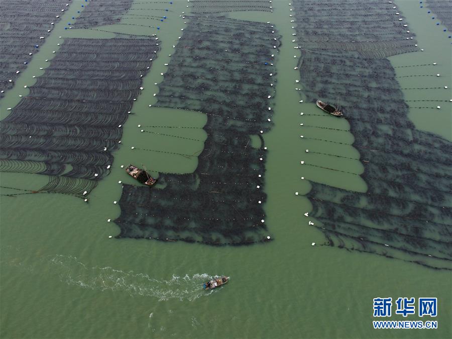 4月10日,霞浦縣長(zhǎng)春鎮(zhèn)海域,海帶養(yǎng)殖戶在用船只收獲海帶(無人機(jī)拍攝)。新華社記者姜克紅攝