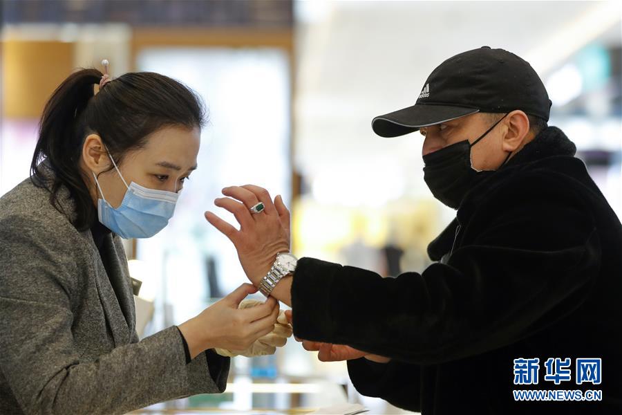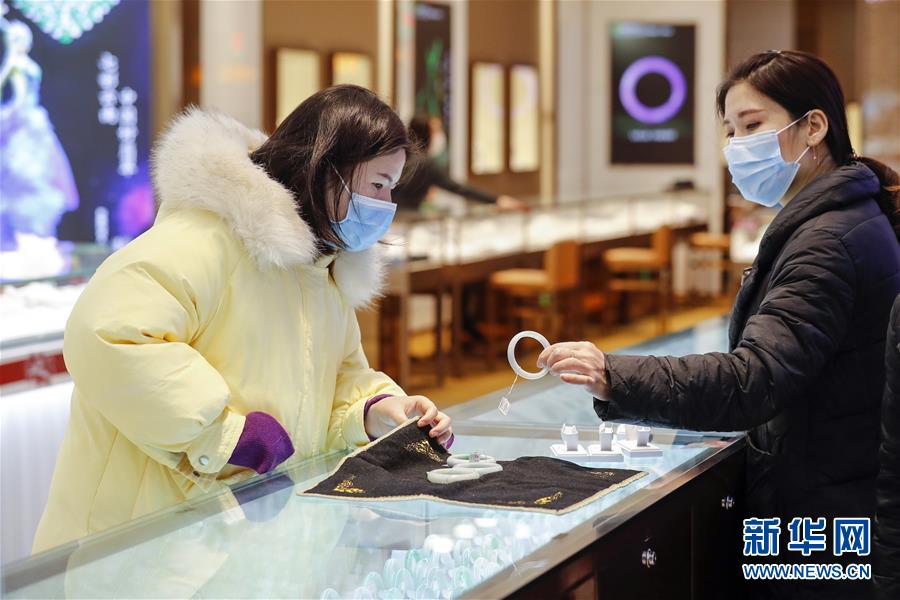 3月30日,在武漢市武商世貿(mào)廣場(chǎng),一名顧客(左)在挑選手鐲。當(dāng)日,武漢市多家商場(chǎng)開門迎客。新華社記者沈伯韓攝
