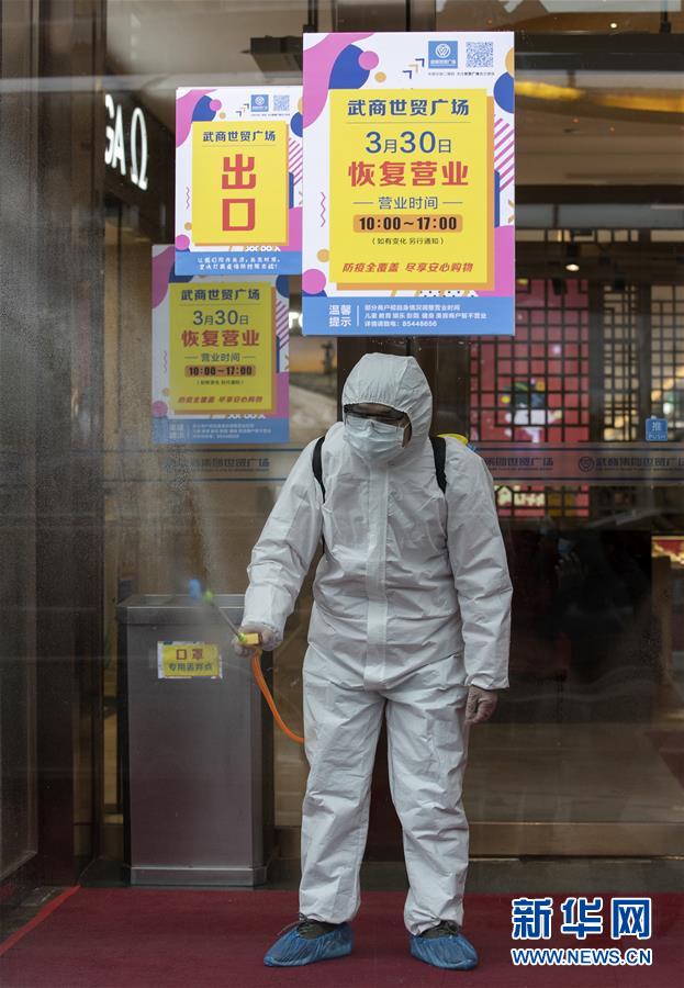 3月30日,在武商世貿(mào)廣場(chǎng),工作人員在開門前進(jìn)行最后的消殺工作。當(dāng)日,武漢市多家商場(chǎng)開門迎客。新華社記者費(fèi)茂華攝