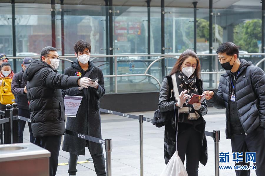 3月30日,在武商國(guó)際廣場(chǎng)的超市前,工作人員測(cè)量顧客的體溫、查看健康碼。當(dāng)日,武漢市多家商場(chǎng)開門迎客。新華社記者費(fèi)茂華攝