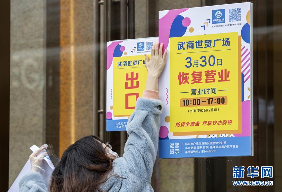 3月30日,在武商世貿(mào)廣場(chǎng),工作人員在開門前布置標(biāo)志牌。當(dāng)日,武漢市多家商場(chǎng)開門迎客。新華社記者費(fèi)茂華攝