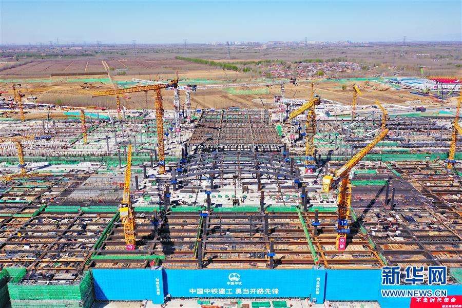 這是3月27日拍攝的京雄城際鐵路雄安站施工現(xiàn)場(無人機照片)。新華社記者楊世堯攝