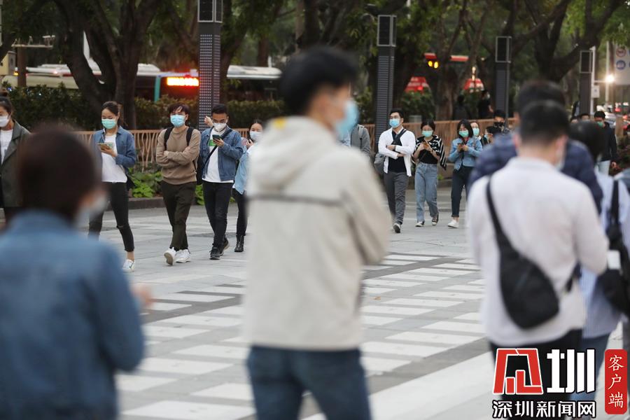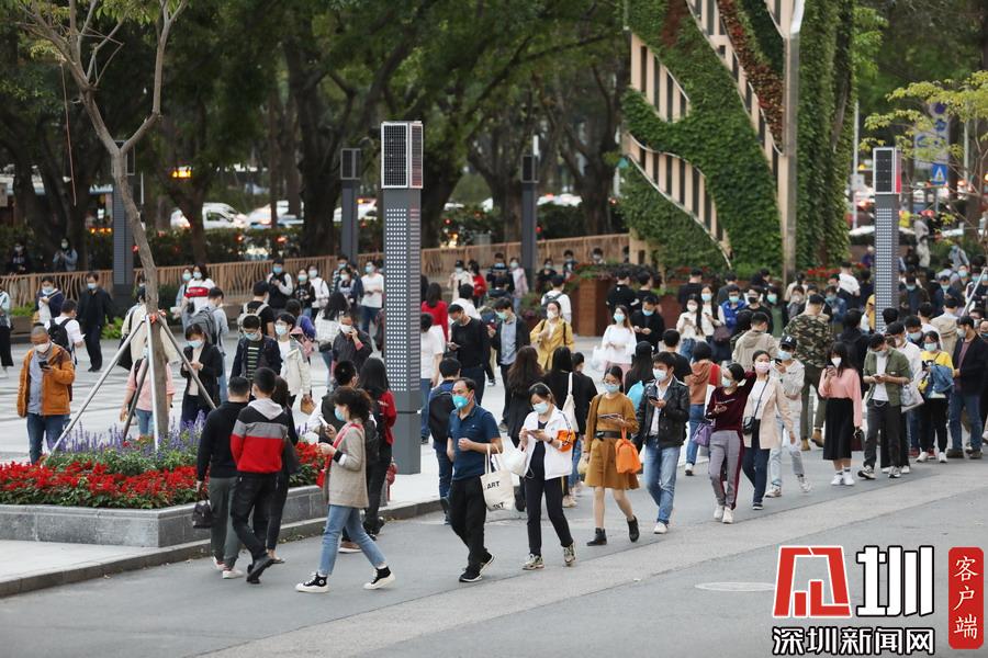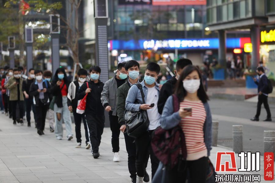 見圳客戶端·深圳新聞網(wǎng)2020年3月19日訊 下班時間,深圳地鐵一號線深大站A3出口外,下班后的市民在站外排大排長龍,依次有序進(jìn)入地鐵站乘坐列車回家。