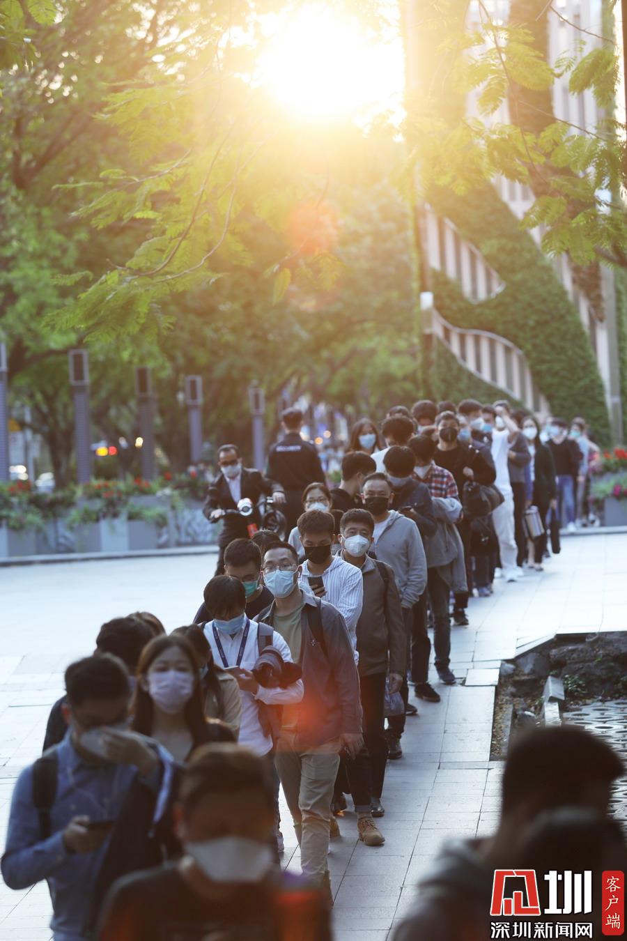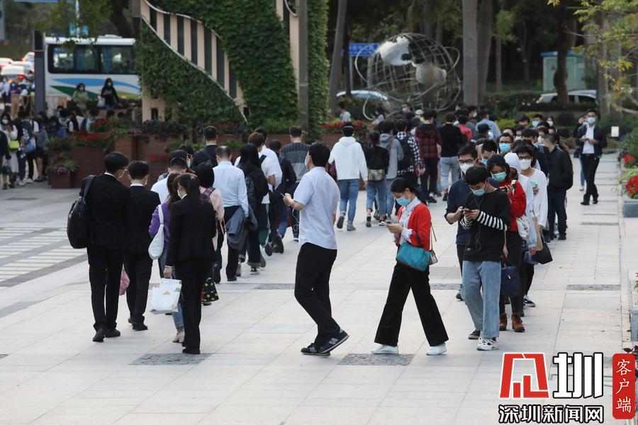 據(jù)悉,深圳地鐵實(shí)行客流管控,控制車站人員密度。由于下班高峰客流量較大,“人龍”排到一旁的科技園文化廣場,形成“蛇餅”隊(duì)伍,秩序卻十分井然。