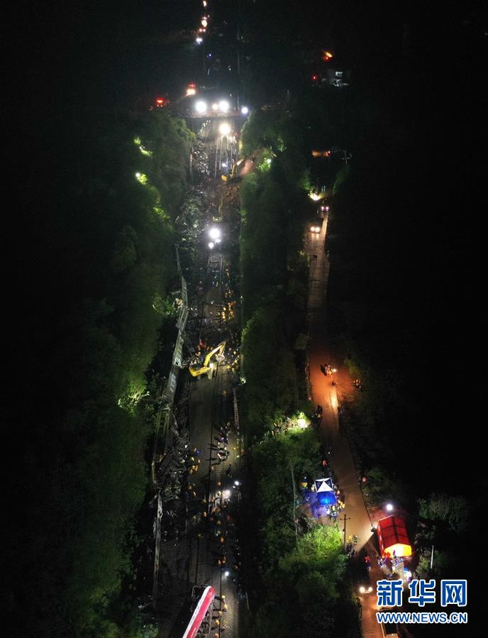 3月30日晚,工程機(jī)械在京廣鐵路郴州段脫軌事故現(xiàn)場作業(yè)(無人機(jī)照片)。新華社記者李尕攝