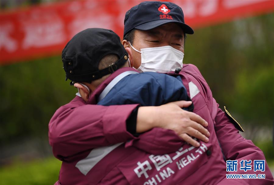 4月3日,陜西省第一批援鄂醫(yī)療隊隊長易智(右)和隊員擁抱作別。 當(dāng)日,陜西省第一批援鄂醫(yī)療隊137名隊員在陜西省工人療養(yǎng)院結(jié)束了為期兩周的隔離休養(yǎng)。醫(yī)療隊員與“戰(zhàn)友”深情作別后,陸續(xù)踏上歸途。 新華社記者 李一博 攝