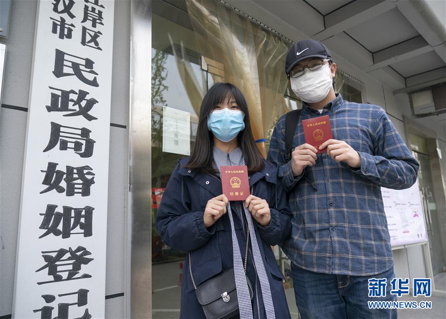 4月7日,在武漢市江岸區(qū)民政局婚姻登記處,新人盧先生和丁女士展示結(jié)婚證。 新華社記者才揚攝