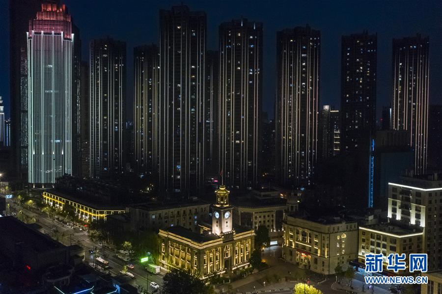 這是4月7日晚拍攝的武漢市江漢關(guān)博物館及附近建筑燈光夜景(無(wú)人機(jī)拍攝)。新華社記者沈伯韓攝