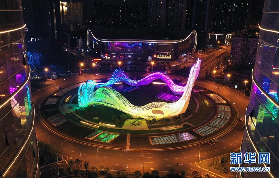 4月7日,武漢光谷環(huán)島開(kāi)啟燈光秀(無(wú)人機(jī)照片)。當(dāng)日,隨著武漢解除離漢通道管控進(jìn)入倒計(jì)時(shí),全市開(kāi)啟了城市景觀照明,夜色中的武漢美不勝收。新華社記者李賀攝