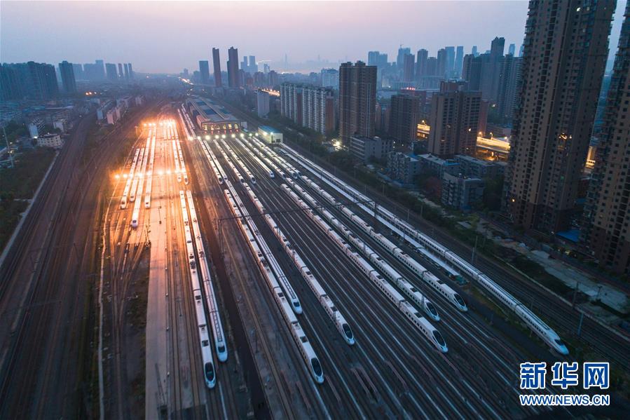 4月8日,在武漢動(dòng)車段,列車??吭诖孳嚲€上準(zhǔn)備投入運(yùn)行(無人機(jī)照片)。 新華社記者 肖藝九 攝