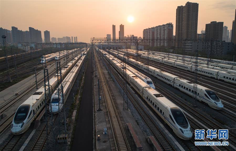 4月8日,在武漢動車段,列車??吭诖孳嚲€上準備投入運行(無人機照片)。 新華社記者 肖藝九 攝