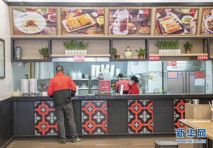 4月8日,在武漢市洪山區(qū)智和路附近的一家熱干面館,工作人員在制作熱干面。新華社記者才揚(yáng)攝