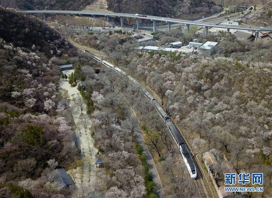 4月8日,北京青龍橋火車站附近春花盛開(無人機照片)。 新華社記者張晨霖攝