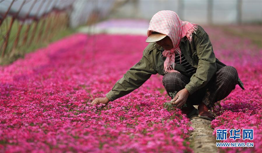 4月13日,在八角臺(tái)街道雅化村花圃內(nèi),花農(nóng)為培育的宿根花卉除草。新華社記者姚劍鋒攝