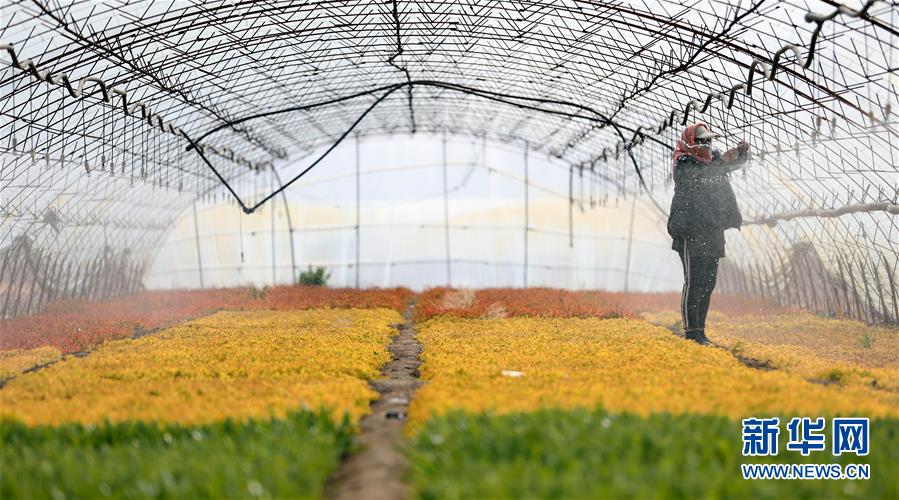 4月13日,在八角臺街道雅化村花圃內(nèi),花農(nóng)苗景香修理噴淋器。新華社記者姚劍鋒攝