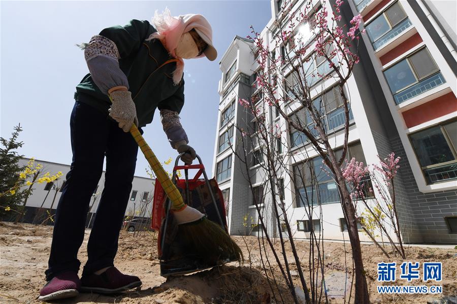 在古浪縣綠洲生態(tài)移民小城鎮(zhèn),胥存打掃小城鎮(zhèn)花園衛(wèi)生(4月7日攝)。新華社記者范培珅攝