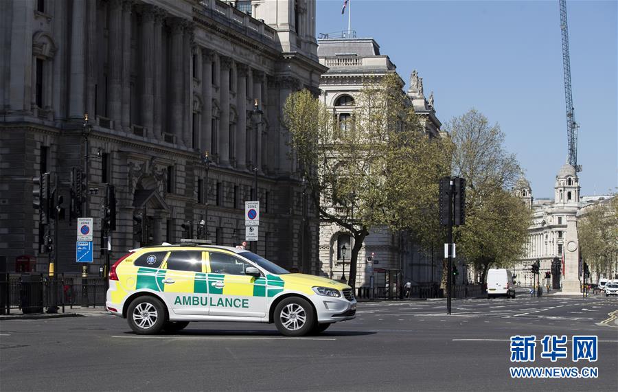 4月14日,在英國倫敦,一輛救護(hù)車從議會街前駛過。新華社記者韓巖攝
