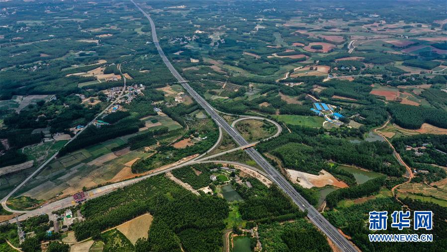 這是4月21日拍攝的合浦縣境內(nèi)的桂海高速公路(無人機(jī)照片)。暮春時(shí)節(jié),從空中俯瞰廣西北海市合浦縣大地,河流、稻田、蝦塘、道路、村莊星羅棋布、色彩斑斕,美不勝收。新華社記者張愛林?jǐn)z