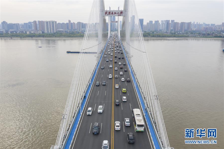 4月14日,武漢長(zhǎng)江二橋上車流如織(無(wú)人機(jī)照片)。新華社記者才揚(yáng)攝