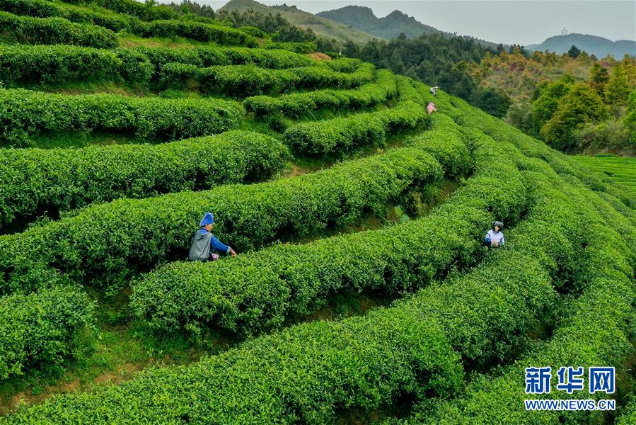 4月25日,茶農(nóng)在“扶貧茶園”內(nèi)采茶(無(wú)人機(jī)照片)。谷雨過(guò)后,在貴州省黔東南苗族侗族自治州丹寨縣“扶貧茶園”,茶農(nóng)搶抓農(nóng)時(shí)趕制春茶。丹寨縣創(chuàng)新產(chǎn)業(yè)扶貧模式,鼓勵(lì)社會(huì)公眾線上認(rèn)領(lǐng)茶園,再由茶園聘請(qǐng)當(dāng)?shù)刎毨魟?wù)工,為貧困戶創(chuàng)造茶園管理、采茶、制茶等就業(yè)機(jī)會(huì),幫助貧困戶增收。今年以來(lái),“扶貧茶園”已接受線上預(yù)訂600余畝,給當(dāng)?shù)?00余名村民提供了就業(yè)機(jī)會(huì)。新華社記者歐東衢攝