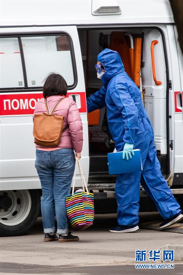 4月27日,在俄羅斯首都莫斯科,醫(yī)護(hù)人員(右)引導(dǎo)一名女子走上救護(hù)車(chē)。據(jù)俄羅斯防疫指揮部27日消息,過(guò)去24小時(shí)俄新增新冠肺炎確診病例6198例,累計(jì)確診87147例,單日增幅7.66%。新華社記者白雪騏攝