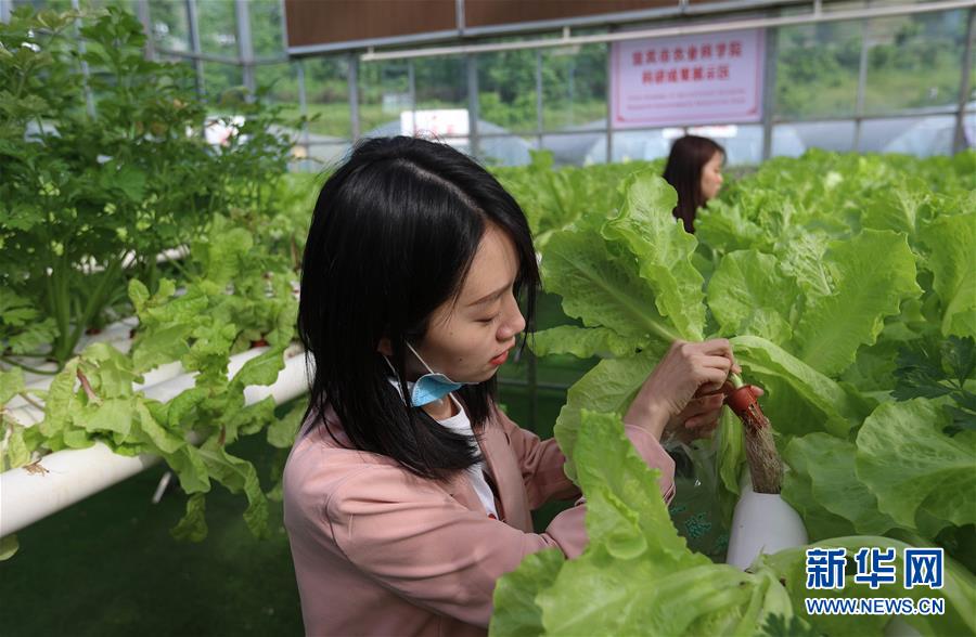 4月29日,參觀者在珙縣三合村現(xiàn)代農(nóng)業(yè)產(chǎn)業(yè)示范園區(qū)觀看無(wú)土栽培的蔬菜。新華社記者江宏景攝