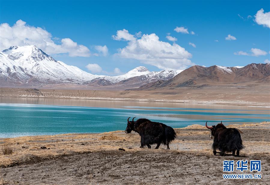 4月30日,兩只牦牛在當(dāng)穹錯湖畔。當(dāng)穹錯地處西藏那曲市尼瑪縣南部,湖面海拔4475米。暮春時節(jié),湖水碧藍清亮,讓人仿佛置身仙境。新華社記者侯捷攝