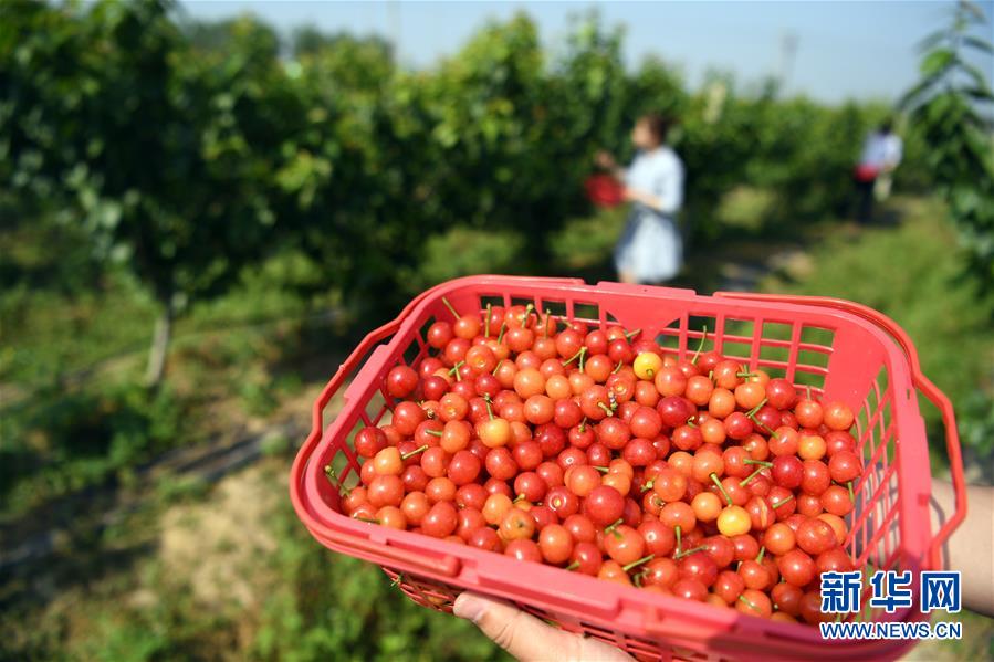5月3日,農(nóng)民在豐樂鎮(zhèn)鳳嶺苗木種植扶貧產(chǎn)業(yè)園里采摘櫻桃。新華社記者劉軍喜攝
