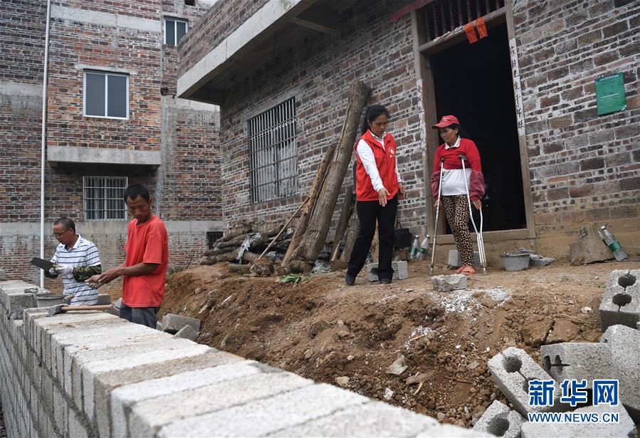唐莉(右二)在平樂縣張家鎮(zhèn)老埠村貧困戶陶仁桂家查看無障礙設(shè)施改造項目建設(shè)進展(5月4日攝)。新華社記者周華攝