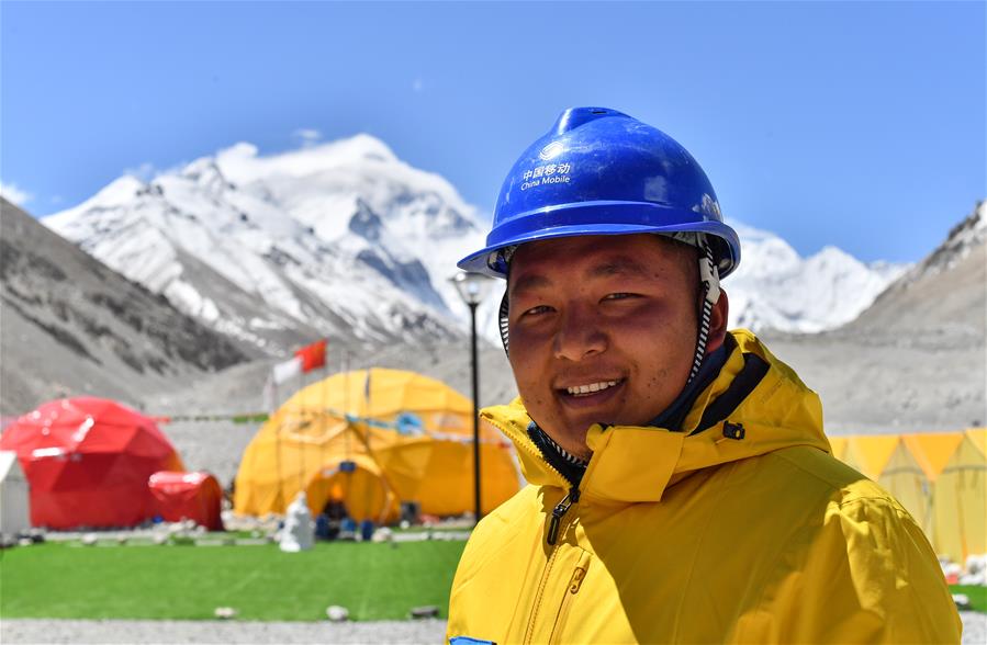 中國移動(dòng)西藏公司員工土旦頓桑在珠峰大本營(5月8日攝)。5月8日是世界微笑日。在海拔5200米的珠峰大本營,參與2020珠峰高程測量的各方人員,微笑期待本次測量活動(dòng)的圓滿成功。