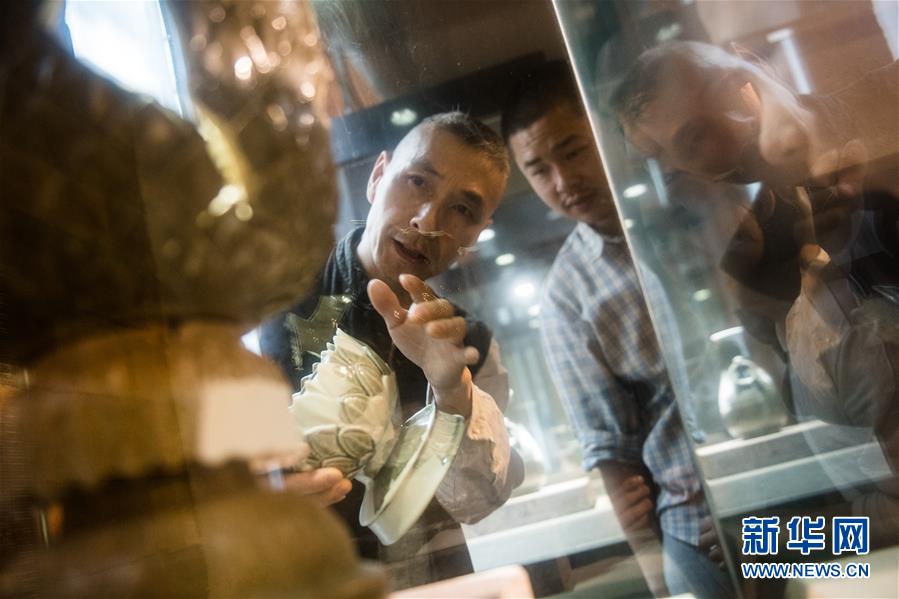 5月8日,項宏金(左)在龍泉青瓷裝飾紋樣研究所向來訪的年輕瓷人介紹兩件蓮瓣紋作品的細節(jié)。1965年出生的項宏金,被浙江龍泉年輕一代瓷人稱為“項哥”,他從20世紀90年代開始收集龍泉青瓷標本,研究青瓷紋樣。2014年出版著作《龍泉青瓷裝飾紋樣》,次年開設龍泉青瓷裝飾紋樣研究所,將自己收藏的千余件標本跟瓷器愛好者、創(chuàng)作者免費分享。新華社記者翁忻旸攝