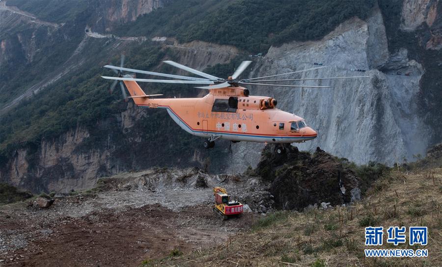 一架米-26重型直升機在布拖縣阿布洛哈村吊運挖掘機(2019年12月5日攝)。新華社記者江宏景攝