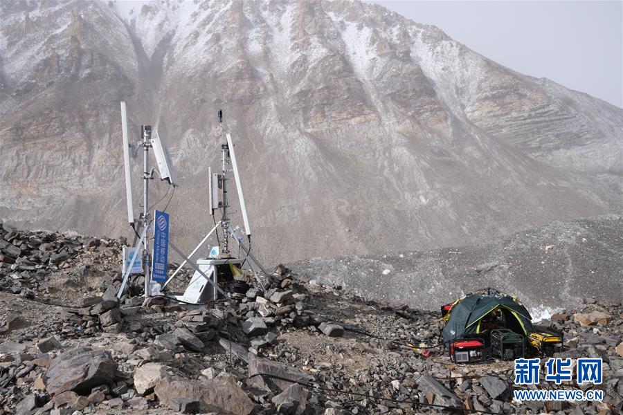 過(guò)渡營(yíng)地附近的中國(guó)移動(dòng)基站(5月8日攝)。珠峰過(guò)渡營(yíng)地海拔5800米,是連接前進(jìn)營(yíng)地和珠峰大本營(yíng)的重要一站。登山愛(ài)好者從大本營(yíng)徒步大約四個(gè)小時(shí)就能抵達(dá)過(guò)渡營(yíng)地。此段路程亂石林立,同時(shí)也能欣賞壯美的冰川。新華社記者孫非攝
