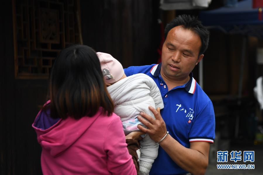施六金(右)從妻子手中接過兒子施澤恩(4月25日攝)。1973年出生于十八洞村的施六金,由于父親患病很早就放棄學(xué)業(yè)和母親扛起了家庭的重?fù)?dān)。為了生活,他還曾遠(yuǎn)去東南亞打工。2015年,看到家鄉(xiāng)的變化,施六金回到村里開起了農(nóng)家樂,年度家庭人均純收入也從2014年的1715元增長到了2019年的35696元。2018年,施六金與心愛的人組建了家庭。今年初,施六金與愛人迎來了一個大胖小子?!白鋈俗鍪乱没貓蠛透卸?。”施六金給剛出生的兒子取名施澤恩。新華社記者薛宇舸攝