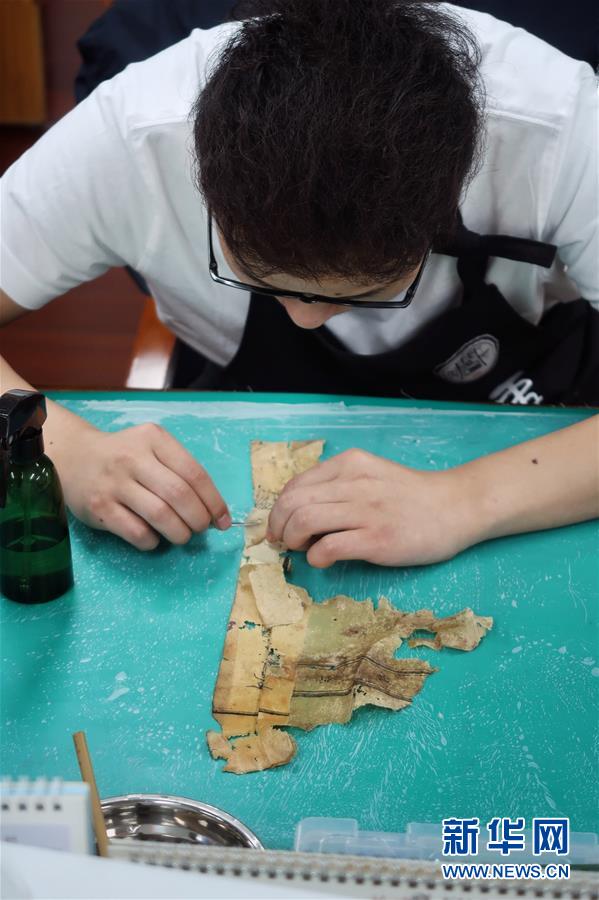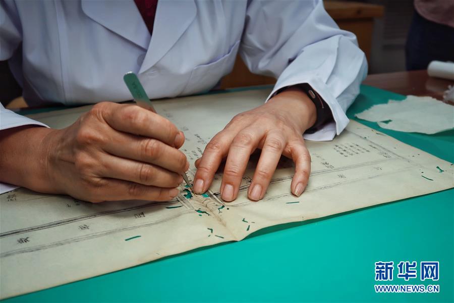 5月13日,天一閣藏品修復(fù)部主任王金玉在對(duì)書(shū)頁(yè)進(jìn)行修復(fù)。天一閣藏品修復(fù)部目前有修復(fù)師14人,每年約修復(fù)古籍14000余頁(yè)。據(jù)介紹,修復(fù)一冊(cè)古籍通常需要1至2個(gè)月,有的甚至需要1年以上。新華社記者鄭夢(mèng)雨攝