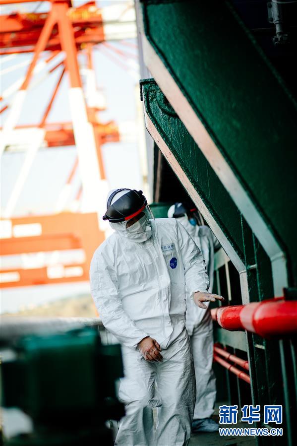 5月13日,山東威海出入境邊防檢查站民警登上國(guó)際集裝箱貨輪檢查。新華社記者朱崢攝