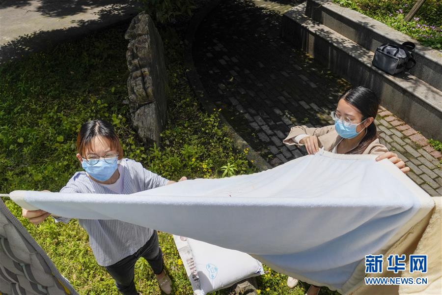 5月15日,在西南大學(xué)一棟宿舍樓下,一名返校大學(xué)生(左)在輔導(dǎo)員老師的幫助下曬被子。當(dāng)日,重慶西南大學(xué)迎來疫情以來首批返校大學(xué)生。據(jù)介紹,按照疫情防控的需要,重慶市高校2020年春季學(xué)期從5月11日起按照“一校一策”原則,實(shí)行錯(cuò)峰錯(cuò)時(shí)分批次有序開學(xué)復(fù)課。新華社記者劉潺攝