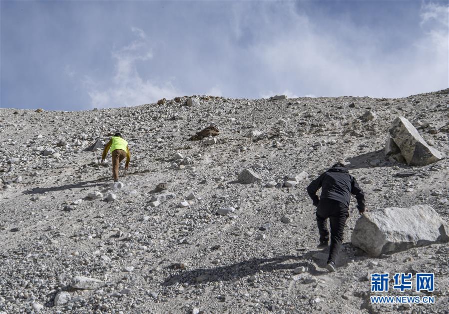 巡邏路上遇到車走不了的地方,拉巴次仁和同事就徒步攀爬,進行巡邏(5月15日攝)。新華社記者孫非攝
